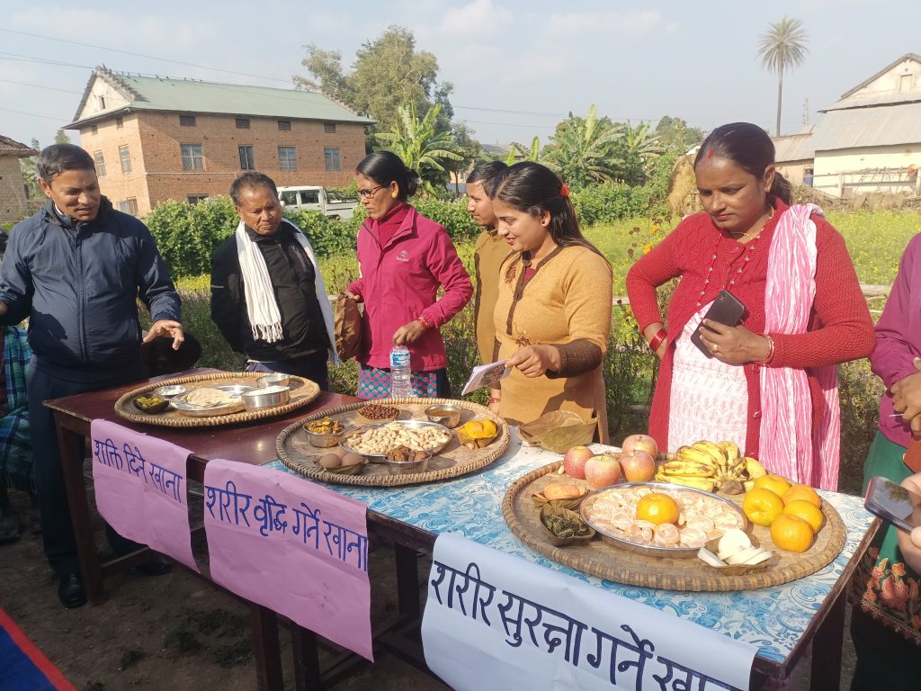 पोषण मेलामा खानाका प्रकार,शक्तिदिने खाना ,वृद्धि र विकासका लागि चाहिने खाना,र सुरक्षा दिने खानाहरुको प्रदर्शनगरी बुझाइएकोथियो ।हरेकवार खाना चारको सिद्धान्तलाइ दैनिक जिबनमा अनिवार्य लागुगर्नुपर्ने बोल्ने बक्ताहरुको भनाइथियो ।
