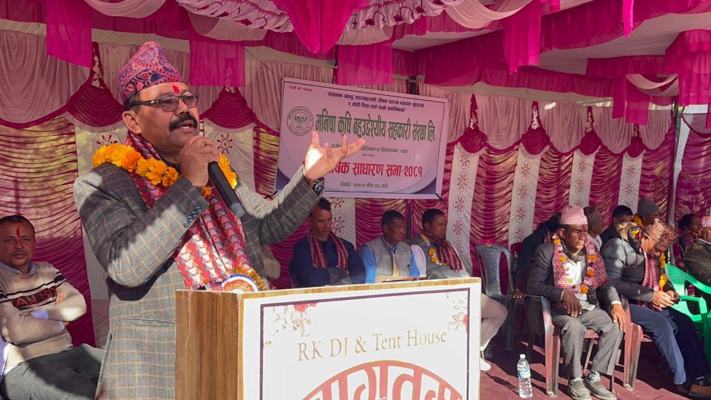 सहकारीको ८ औं साधारणसभाको उद्घाटन गर्दै गाउँपालिका अध्यक्ष शम्भु गिरीले समयको विकास सङ्गै सहकारीहरुपनि परीवर्तितहुन आवस्यक रहेको बताउनुभयो ।सहकारीको माध्यमबाट कृषि उत्पादनमा जोडदिदै महिलाहरु आत्मनिर्भर हुनुपर्ने बताउनुभयो ।आफुहरु निर्वाचितभएर आयपस्चात सहकारीको माध्यमबाट कृषिमा सुधार तथा किसानहरुको सहजताका लागि संकलन केन्द्रहरुको निर्माणमा अगाडि बढेको बताउनुभयो ।
