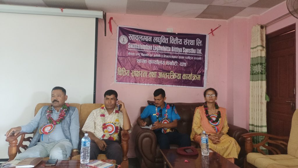 स्वाबलम्बन लघुबित्त वित्तीय सस्था लि.साखा कार्यालय धनौरीले बित्ती साक्षरता तथा अन्तर्कृया कार्यक्रम दंगीशरण गाउँपालिकाको सभाहलमा सम्पन्न गरेकोछ ।स्वाबलम्बन वित्तीय सस्थाबाट दिइने सेवा सुबिधा,सस्थामा पहिले भएका निति नियम र परीमार्जित निति नियमहरुका वारे आफ्ना केन्द्र प्रमुख तथा सदस्यहरुका लागि एकदिने वित्तीय साक्षरता तथा अन्तर्कृया कार्यक्रम सम्पन्न गरेको हो ।दाङ जिल्लामा ५ वटा शाखा कार्यालयवाट सेवा सन्चालन गरेको लघुबित्तले ग्रामीण गरीव र पिछडिएको बर्गलाइ ऋणमा सजिलो पहुँच प्रदान गरीरहेको साखा कार्यालय धनौरीका साखा प्रमुख बिमल श्रेष्ठले बताए ।२०५८ साल माघ १ गतेदेखि आफ्नो विधिवत कारोबार सन्चालनमा ल्यायको लघुबित्तले २०५० साल देखिनै नेपालका सिराह सप्तरी र उदयपुरका जिल्लाका एक एक गा.वि.स.मा ग्रामीण पद्धतिमा आधारीत स्वाबलम्बन बैन्किङ कार्यक्रम मार्फत मार्फत सेवा अगाडि बढाएकोथियो ।
