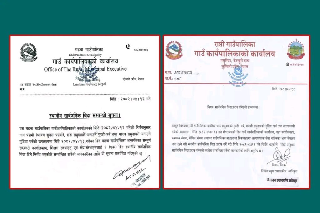 गाउँपालिकाहरूले छुट्टाछुट्टै सूचना जारी गर्दै धार्मिक तथा सांस्कृतिक महत्वको पर्व नागपञ्चमीका दिन सार्वजनिक विदा दिने जनाएका हुन्।