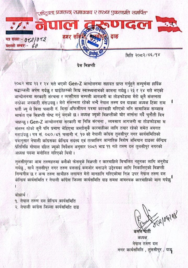 सबै कसैको फेसबुके बिज्ञप्तीले कत्ती पनि बिचलित नहुने नेपाल तरुणदल तुलसीपुर नगर अध्यक्ष कमल घर्तीको भनाइ । प्रमोद आचार्य २०८२ आश्विन १४, मंगलवार १३:४१ 0 Continue Reading Previous नेपाली कांग्रेस विचार र सिद्धान्तको स्रोत: काङ्ग्रेस नेता केशव अचार्यNext दंगीशरणमा विपद् जोखिम न्यूनीकरण तथा संचार रणनीतीको मस्यौदामाथि छलफल तथा सुझाव संकलन थप कथाहरू सबै दंगीशरणमा सिकल सेल तथा थालासेमिया परीक्षण शिविर सम्पन्न प्रविण चौधरी २०८२ चैत्र ६, शुक्रबार १४:०५ 0 सबै पश्चिम नेपालमा तीव्र हावाहुरीको सम्भावना, सतर्कता अपनाउन आग्रह प्रविण चौधरी २०८२ चैत्र ६, शुक्रबार ०२:५४ 0 सबै दंगीशरणमा बालविवाह न्यूनीकरण र बाल अधिकारसम्बन्धी दुईदिने कार्यशाला सुरु प्रविण चौधरी २०८२ चैत्र ५, बिहीबार ०८:५७ 0 Leave a Reply Cancel replyYour email address will not be published. Required fields are marked *Comment * Name * Email * Website Save my name, email, and website in this browser for the next time I comment.