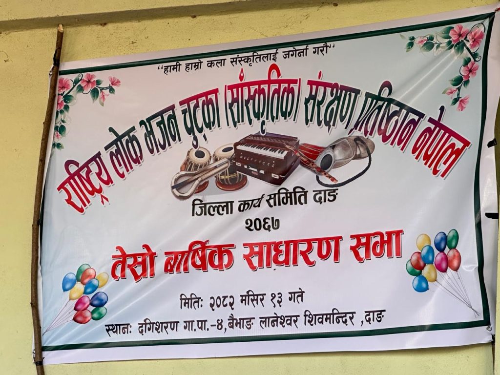 यसैबीच, राष्ट्रिय लोक भजन चुट्का सांस्कृतिक संरक्षण प्रतिष्ठान नेपाल, जिल्ला समिति दाङको आयोजनामा तेस्रो वार्षिक साधारणसभा दंगीशरण–४ स्थित लानेश्वर शिव मन्दिरमा सम्पन्न भएको छ।