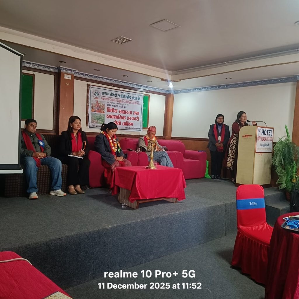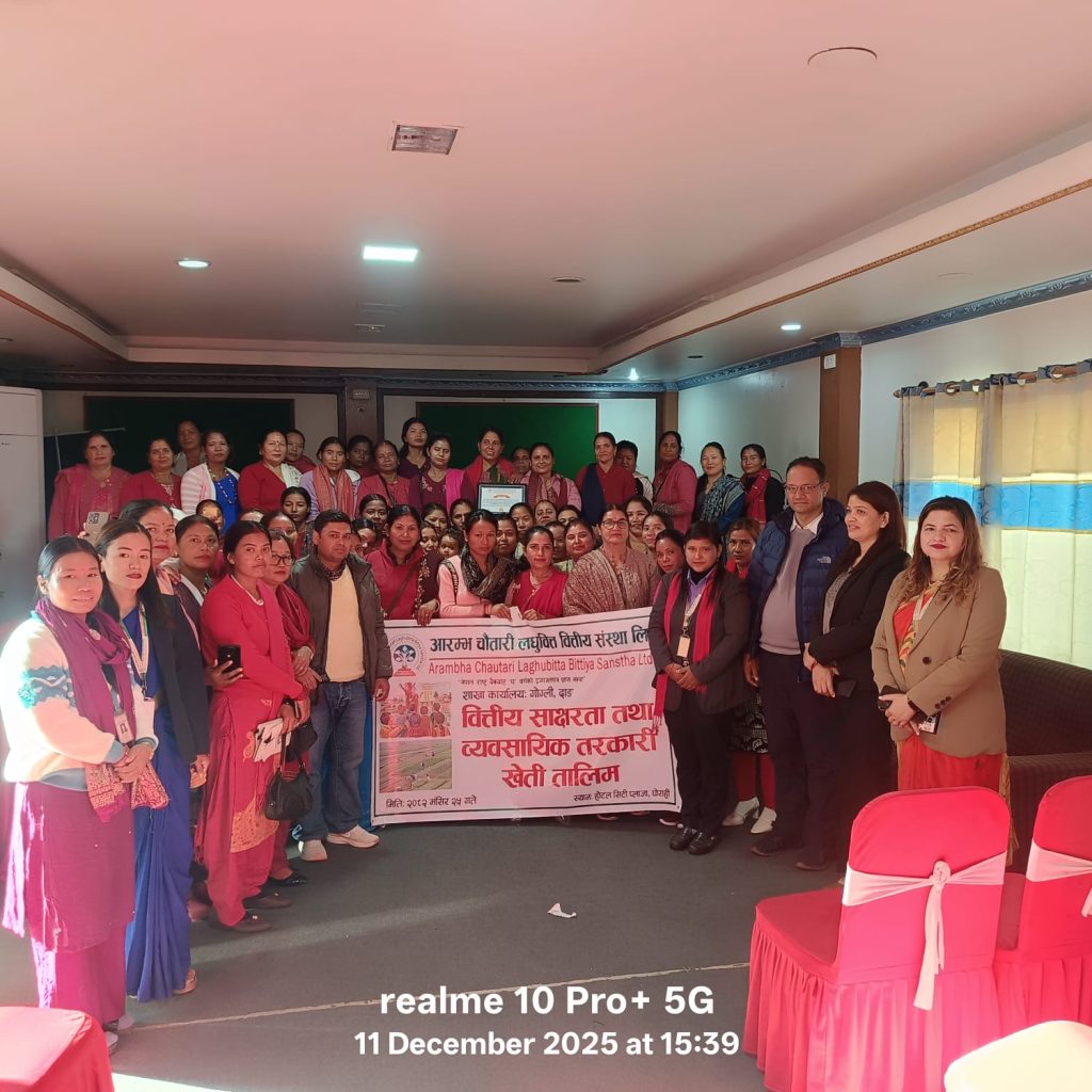 दाङ, गोग्ली । आरम्भ चौतारी लघुवित्त वित्तीय संस्था लिमिटेड, शाखा कार्यालय गोग्लीले संस्थामा आवद्ध सदस्यहरूका लागि एक दिने वित्तीय साक्षरता तथा व्यावसायिक तरकारी खेती तालिम सम्पन्न गरेको छ। तालिम स्टेशन कार्यालय हेकुलीका अनुगमन अधिकृतको अध्यक्षतामा तथा घोराही उपमहानगरपालिकाकी उपमेयर हुमा कुमारी डी.सी. को प्रमुख आतिथ्यतामा सम्पन्न भएको हो।
